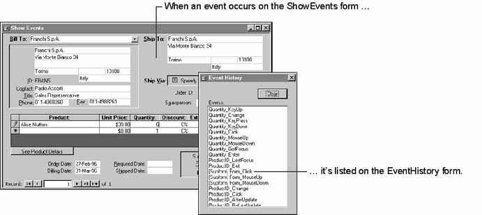 You can see the events that are generated in Microsoft Access by opening the ShowEvents form in the Orders sample application. The ShowEvents form, a special version of the Orders form, records each event as it occurs. An accompanying EventHistory form lists the name of the event and the type or name of the object on which the event occurred, using the format object_event. For example, if a Click event occurs on the ShowEvents subform, the line "[Subform]Form_Click" is added to the Events list on the EventHistory form.