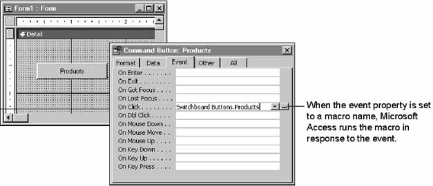 For example, when you click a command button whose OnClick event property is set to a macro, Microsoft Access: