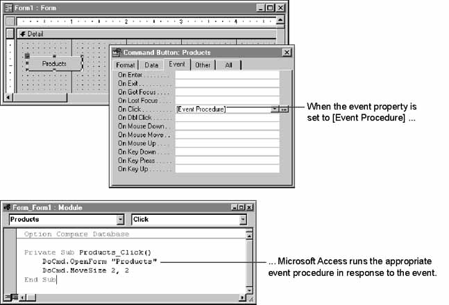 When the event property is set to [Event Procedure], Microsoft Access responds to the event by running the appropriate event procedure in addition to performing its built-in behavior. Event procedures are named for the event and the object for which they occur, in the format object_event. For example, if a user clicks the Products command button, Microsoft Access:
