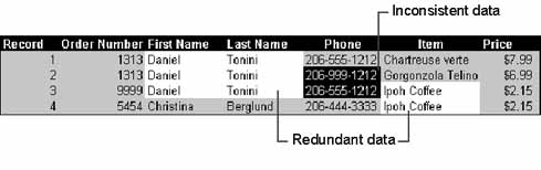 For example, the following illustration shows a single table that contains redundant and inconsistent data.